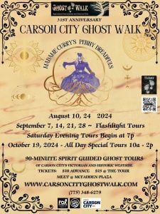 Experience Carson City’s rich and intriguing history as we explore, narrate and theatrically embrace Carson City’s beautiful Victorian founding in these seasonal evening walking tours, led by Madame Curry (a spirited and historically fictional character named after the widow of Carson City’s founder, Abe Curry) and her Spirit Wranglers. These ghostly and witty community spirits lead you through Carson City’s Historic and Haunted West Side highlighting the stories and legends of the Wild West town.