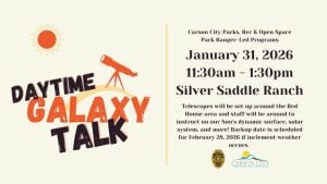 Join the Carson City Park Rangers and Dr. Thomas Herring, Professor of Physics at Western Nevada College, for our first Sun viewing event at Silver Saddle Ranch! Telescopes will be set up around the Red House area and staff will be around to instruct on the Sun’s dynamic surface, our solar system, and more!