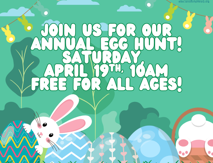 Hop on over to the Carson City Library for our free annual Egg Hunt on April 19th at 10:00 AM! This fun-filled event is open to all ages, so bring the whole family for a morning of excitement and treasure hunting. Children and adults alike will enjoy searching for colorful eggs hidden throughout the library grounds.