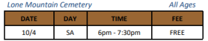 Join the Carson City Park Rangers for a night of spooky historical fun at Lone Mountain Cemetery! Travel around the cemetery learning about the lives and deaths of Carson’s famous historical figures. This tour will be a about a one mile loop under the darkness, so prepare for some spooky happenings. A $10 donation is not required, but strongly encouraged to Lone Mountain Cemetery.
